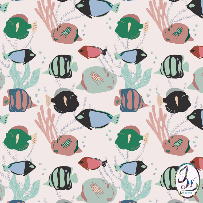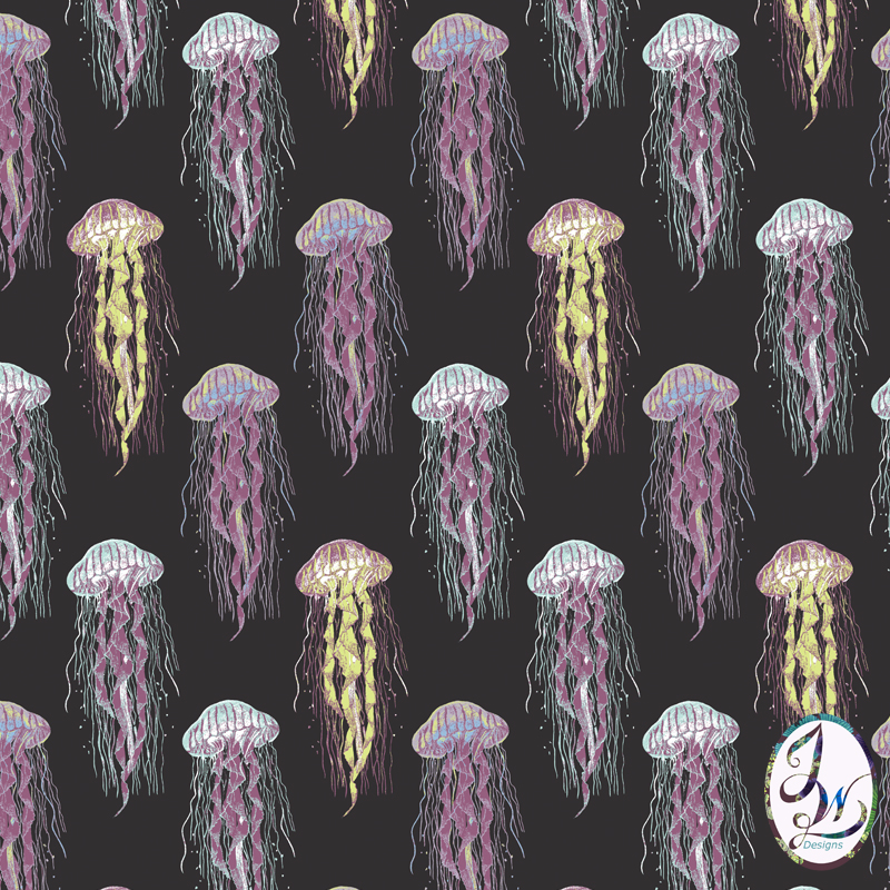 This collection grew from a drawing of a jelly fish I completed for a fun little drawing challenge I took part in with some friends. We each took turns setting a daily drawing challenge or theme, one of which was under the sea. Living in Scotland, we get a lot of jelly fish floating around our shores and harbours and I have always found them fascinating to watch. I came across the drawing about a year later, while participating in MIID Summer School 2019. I developed the first design as part of the design challenge and later the coordinating patterns.